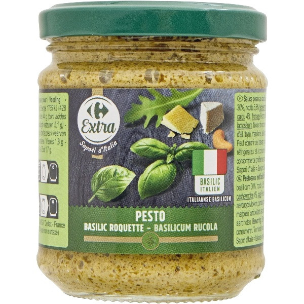 Huile de tournesol, basilic 30%, ricotta 5,5% (lactosérum, lait, correcteur d'acidité : acide citrique), persil 5%, noix de cajou 4%, fromage Pecorino Romano AOP 4%, sel, roquette 1,5%, sucre, protéines de lactosérum, flocons de pomme de terre, fibres végétales de bambous et d'agrumes, purée d'ail, thym, marjolaine, antioxydant : acide ascorbique, correcteur d'acidité : acide lactique.